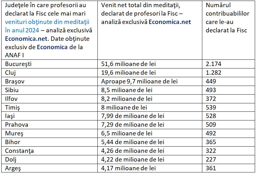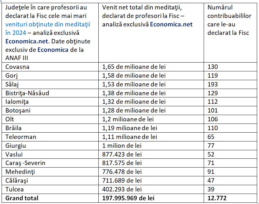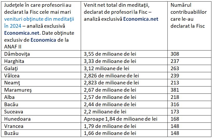 Iată sumele nete pe care profesorii au declarat la Fisc că le-au obţinut din meditaţii în 2024 şi numărul acestora, defalcate pe judeţe, potrivit informaţiilor obţinute de Economica.net de la ANAF: