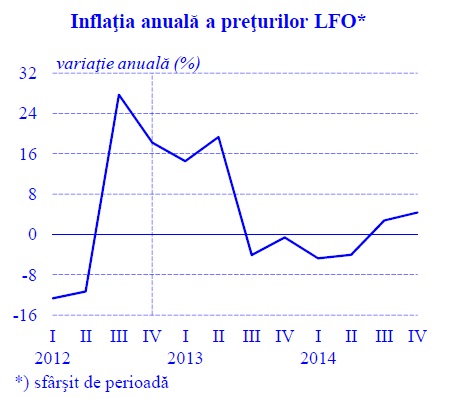 Începând din trimestrul III 2013, sub impactul unui efect de bază favorabil, se anticipează o decelerare importantă a ritmului anual de evoluţie a preţurilor LFO până la orizontul proiecţiei. În aceste condiţii, contribuţia acestei grupe la inflaţia anuală IPC – sfârşit de perioadă – pentru anul curent este preconizată a fi aproximativ nulă, iar pentru anul viitor, de 0,3 puncte procentuale”, se arată în raportul băncii centrale.
