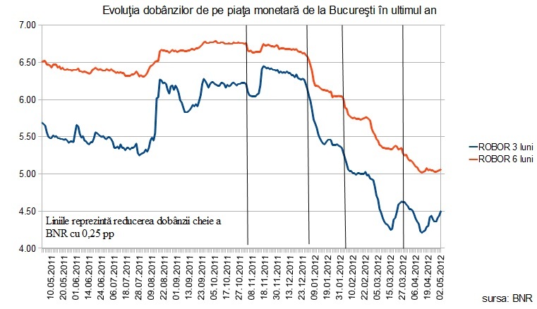 Din noiembrie 2011, BNR a început să reducă dobânda de politică monetară, în trepte de 0,25 pp, după ce aceasta a stat mai bine de un an şi jumătate la nivelul de 6,25%. În martie, BNR a tăiat pentru ultima oară dobânda la nivelul actual minim istoric, după ce inflaţia anuală a ajuns şi ea la cel mai redus nivel de după Revoluţia din 1989.