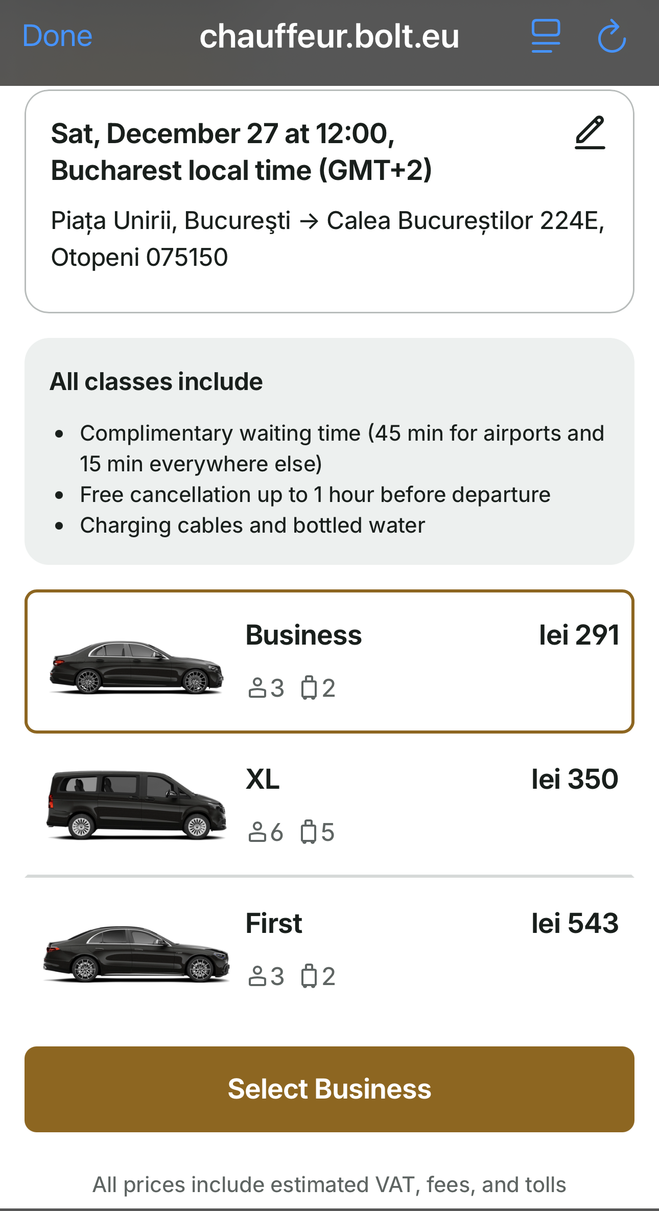 Bolt Chauffeur are disponibile trei clase de mașini: Business (cel mai ieftin), XL pentru până la 6 pasageri și First. Timpul de așteptare este de 45 de minute pentru cursele de la și spre aeroporturi și 15 minute pentru alte destinații.