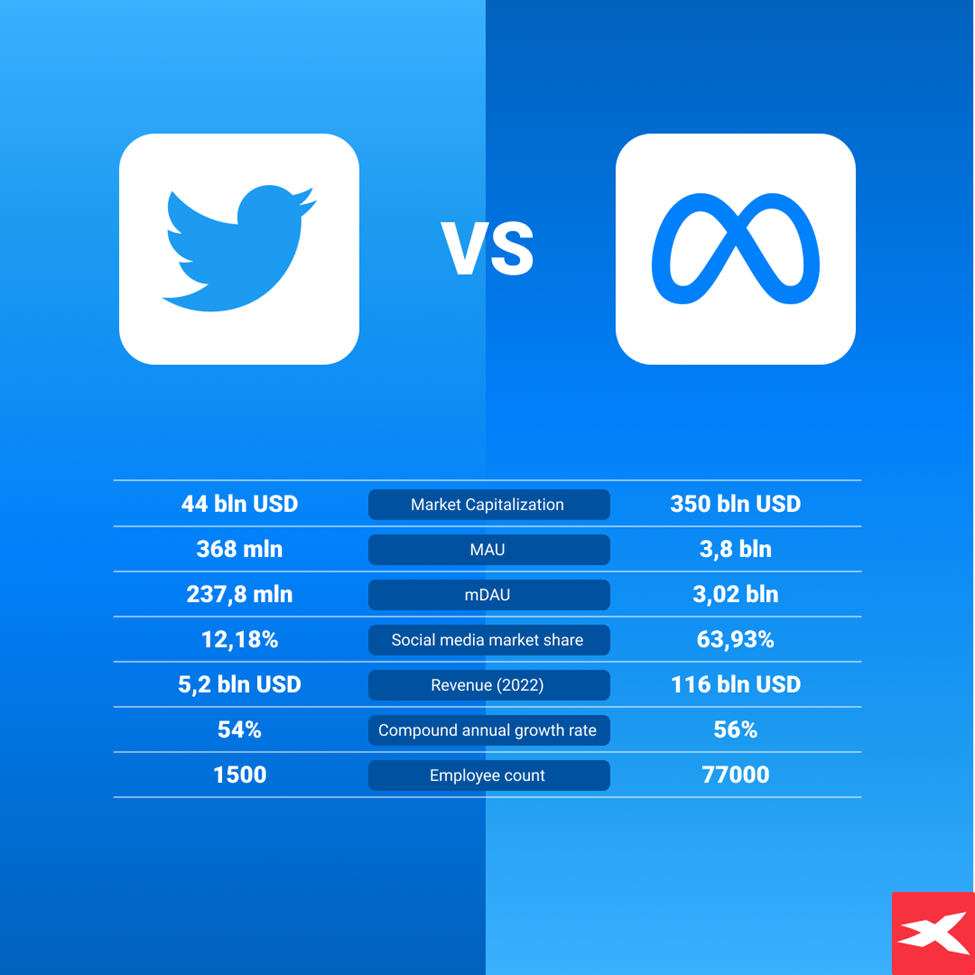 Meta a fost evaluată la peste 350 de miliarde de dolari în octombrie 2022, când Musk a achiziționat Twitter pentru 44 de miliarde de dolari. Twitter și Meta au devenit publice mai mult sau mai puțin în același timp, dar Meta a obținut o creștere anuală compusă a vânzărilor ușor mai mare de la debut (56%) decât Twitter (54%).