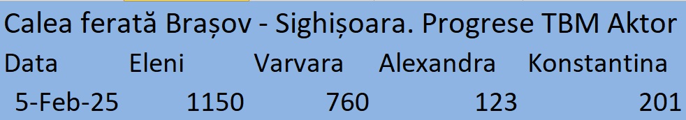 La finalul lunii ianuarie 2025, TBM 3 – Alexandra, care a început forajul la jumătatea lunii octombrie 2024, a forat deja 123 de metri și a instalat 87 de inele din prefabricate de beton, care formează profilul rotund al tunelurilor. TBM 4 – Konstantina a pornit forajul la mijlocul lunii decembrie 2024 și a săpat la rândul său 201 metri în adâncul muntelui, instalând 104 de inele din prefabricate de beton. Ambele sunt intrate complet în munte, precizează cei de la Aktor.