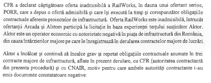 În contestație, Porr solicita anularea raportului procedurii prin care asocierea Arcada – Alstom fusese declarată câștigătoare. În captura foto de mai jos, din cadrul contestației, se pot observa argumente ale firmei contestatoare.