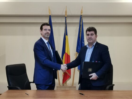 FOTO: Ion Simu Alexandru, director general CFR SA și Martinez Sonnendrucker Pablo, reprezentant al Asocierii WEBUILD SPA – Partecipazioni Italia SPA – SALCEF SPA, sursa Facebook CFR Infrastructură