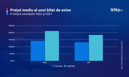 Sezonul de vacanță din acest an a înregistrat o creștere clară a tarifelor companiilor aeriene în comparație cu 2021 și 2020. Potrivit eSky.ro, în perioada iunie-august a acestui an, prețul mediu al unui bilet de avion dus a crescut cu aproximativ 8% față de aceeași perioadă a anului trecut, ajungând la 142 de euro, în timp ce biletele dus-întors s-au scumpit într-o măsură mai mică, 15%, având o medie de 212 de euro.