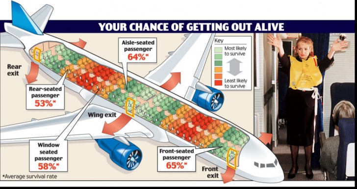 De cealaltă parte, cercetătorii au ajuns la concluzia că cele mai sigure locuri dintr-un avion sunt cele de la margine şi cele cât mai aproape de o ieşire de urgenţă. Anunţul vine după un studiu efectuat pe parcursul a 20 de ani, şi care are la bază 105 accidente aviatice şi interviurile a 2.000 de supravieţuitori. Relativ explicabil, pasagerii care au cel mai multe şanse să supravieţuiască sunt cei aflaţi în vecinătatea unei ieşiri de urgenţă şi pe scaunele din margine, ei putând să iasă cel mai repede din avion. Şansele se reduc simţitor pentru cei care stau la mai mult de 6 rânduri de ieşire, scrie FoxCrawl.