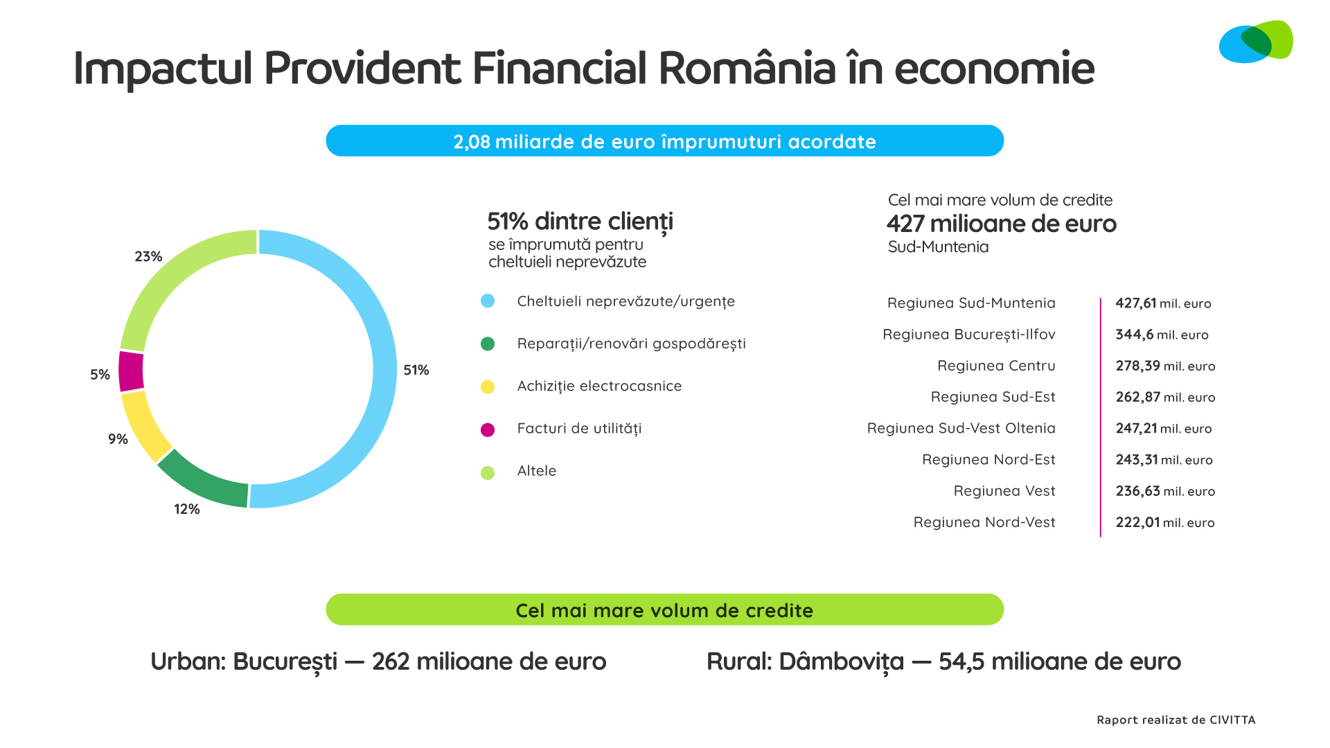 De la începutul activității în România, Provident a acordat împrumuturi în valoare totală de aproape 2,1 miliarde de euro. În 2025, valoarea medie a unui împrumut emis a fost de 4.907 lei. Cel mai mare volum de credite acordat în urban a fost în București, 262 milioane de euro, iar în rural, în județul Dâmbovița, 54,5 milioane de euro. Jumătate dintre clienți s-au împrumutat pentru cheltuieli neprevăzute, 12% pentru reparații și renovări în gospodărie, 9% pentru achiziția de electrocasnice și 5% pentru acoperirea facturilor la utilități.