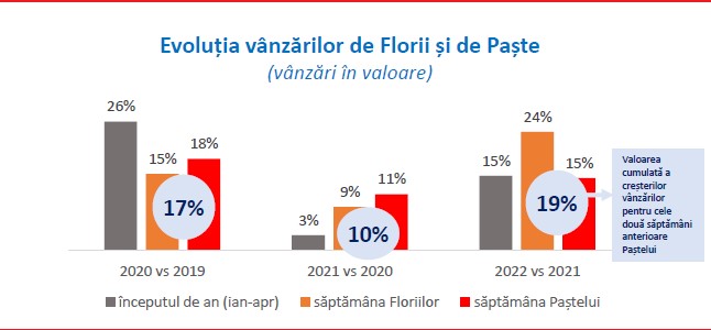 Retailerii moderni au vândut de aceste sărbători pascale mai mult și mai scump față de anul trecut, arată o ultimă analiză a companiei de cercetare Retail Zoom. Valoarea totală a vânzărilor de Paște din 2022, înregistrată pentru aproximativ 200 de categorii de produse alimentare, nealimentare și țigări a fost cu 28% mai mare decât cea din 2020 și cu 51% mai mare decât cea din 2019. Vânzările din săptămânile premergătoare Floriilor și Paștelui au păstrat tradiția creșterilor prin extinderea sortimentului din coșurile de cumpărături, dar și