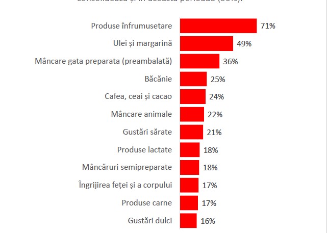 creșterilor de prețuri pentru ulei și margarină (49%), apoi de mâncarea gata preparată, ce menține trendul de creștere și se consolidează și în aceasta perioadă (36%).