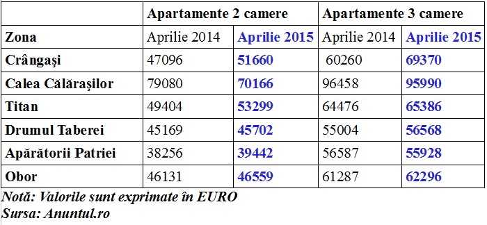 Dacă în Titan şi Crângaşi preţurile au crescut, apartamentele din zona Calea Călăraşilor au înregistrat scăderi. Este cazul apartamentelor cu două camere unde s-a constatat o scădere de 11%. Astfel, dacă anul trecut preţul cerut a fost de 79.080 de euro, în luna aprilie a acestui an s-a ajuns la 70.166 de euro. În cazul preţurilor pentru apartamentele cu trei camere, reducerea a fost de sub % şi a ajuns la 95.990 de euro.
