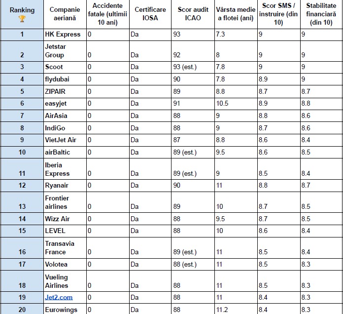 Clasamentul global al siguranței pe 2025 realizat de companie indică cele mai sigure 20 de companii aeriene low-cost din lume, multe dintre ele din Europa.