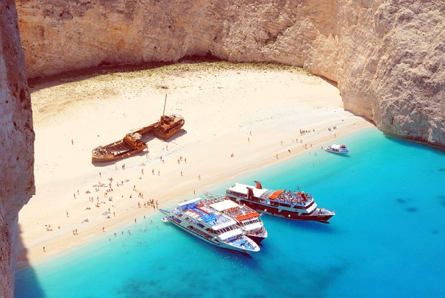 Plaja Navagio din insula Zakynthos este cea mai populară şi o regăsiţi în pliantele agenţiilor de turism. Aici se poate ajunge doar cu vaporaşele. Dar merită! Un sejur de şapte nopţi cu demipensiune şi trnsportul cu avionul inclus porneste de la 500 de euro/persoană.