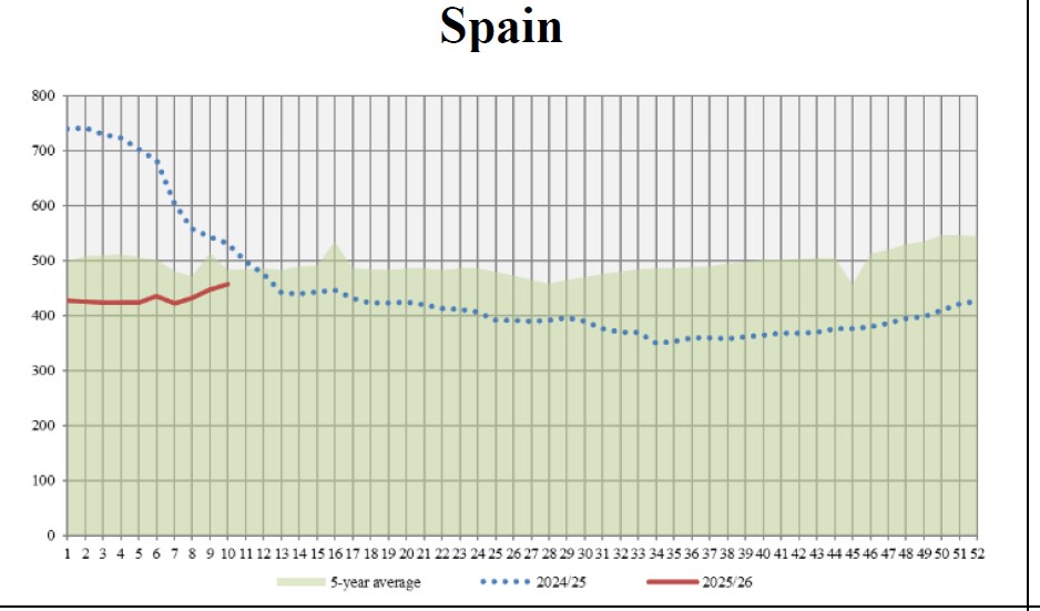 Cât despre prețuri, acestea au avut la final de 2025 o evoluție negativă cu scăderi de până la 30% în unele zone față de perioada similară a anului trecut. Spre exemplu, conform ultimelor date disponibile ale IOC, în săptămâna 8-14 decembrie, prețul mediu de la poarta fermei era la Jaén (Spania) 433 euro pe 100 kg, cu 11 % față de aceeași săptămână a anului agricol precedent. La Bari (Italia), în săptămâna 8-14 decembrie, prețul mediu era de 665 EUR pe 100 kg, cu 30 % mai mic iar în Chania (Grecia), în săptămâna 8-14 noiembrie, prețul era de 465 euro suta de kilograme, cu 6 % mai mic.