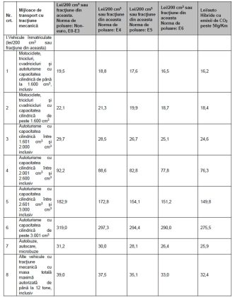 Cei care doresc să realizeze propriile calcule în baza documentului ajuns în posesia presei trebui să știe că, pentru motociclete, tricicluri, cvadricicluri și autoturisme cu capacitatea cilindrică de până la 1.600 cm3 valoarea fiecărei grupe de 200 cmc va fi, în cazul mașinilor cu norma de depoluare Non-Euro – Euro 3, de 19,5 lei. Pentru aceleași vehicule, dar cu norma Euro 4 suma va fi de 18,8 lei, pentru Euro 5 de 17,6 lei, pentru Euro 6 de 16,5 lei, iar pentru hibridele cu emisii mai mari de 50 gr. CO2/km de 16,2 lei.