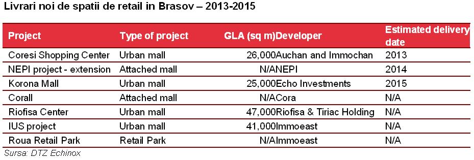 Un singur proiect va fi livrat în Braşov în 2013 – Coresi Shopping Center, dezvoltat de Immochan. Centrul comercial va fi situat pe fosta platformă industrială Tractorul. Construcţia centrului comercial va începe anul acesta şi se va desfăşura pe 24 ha din totalul de 100 ha pe care Immochan le-a achiziţionat. Proiectul va cuprinde un hipermarket Auchan de 16.000 mp, un centru commercial de 25.000 mp închiriabili şi o parcare cu 3.000 de locuri. Compania va investi 55-60 milioane euro în dezvoltarea primei faze a mall-ului din Braşov, a cărui livrare este programată pentru finalul anului 2013. Chiriile în Braşov se situează la 25–30 euro pe mp pentru spaţii de aproximativ 100 mp în locaţii prime.