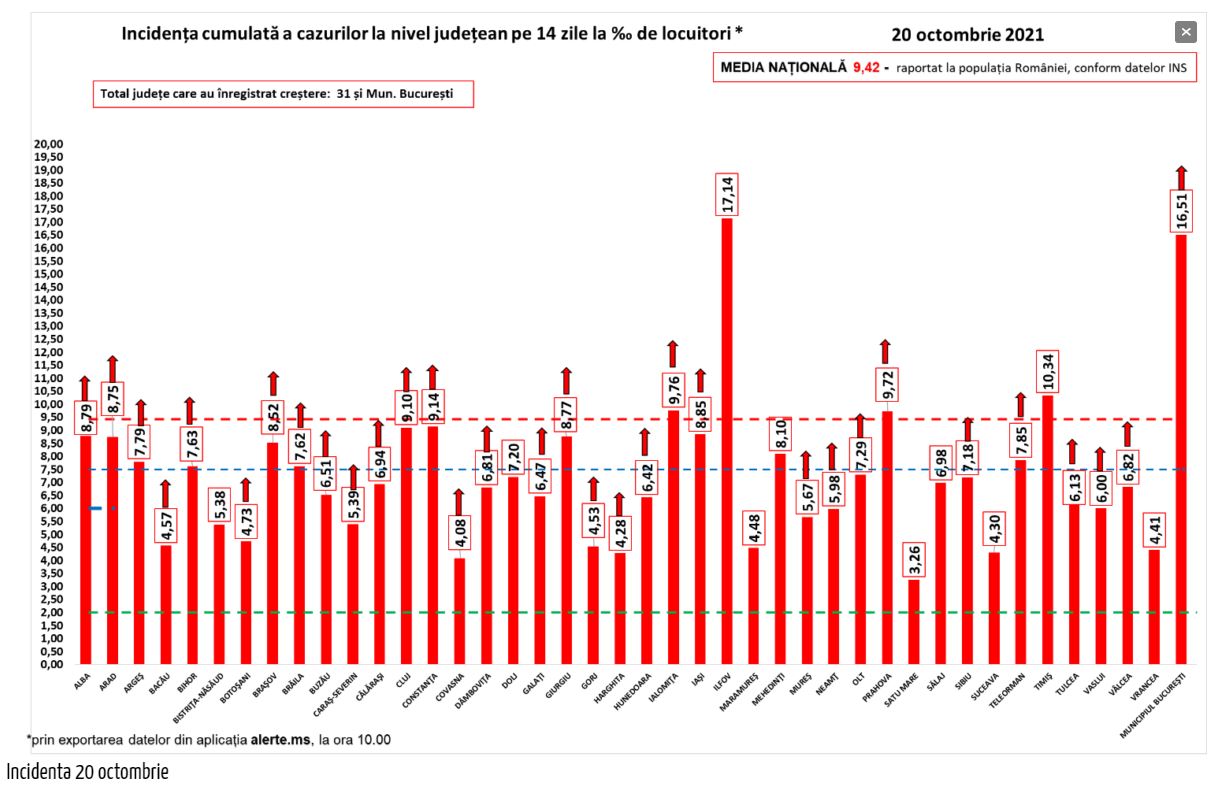 În intervalul 19.10.2021 (10:00) – 20.10.2021 (10:00) au fost raportate de către INSP 423 de decese (232 bărbați și 191 femei), dintre care 9 anterioare intervalului de referință, ale unor pacienți infectați cu noul coronavirus, internați în spitalele din Alba, Arad, Argeș, Bacău, Bistrița-Năsăud, Bihor, Botoșani, Brașov, Brăila, Buzău, Călărași, Caraș-Severin, Cluj, Constanța, Covasna, Dâmbovița, Dolj, Galați, Giurgiu, Gorj, Harghita, Hunedoara, Ialomița, Ilfov, Maramureș, Mehedinți, Mureș, Neamț, Olt, Prahova, Satu Mare, Sălaj, Sibiu, Suceava, Teleorman, Timiș, Tulcea, Vaslui, Vrancea și Municipiul București.