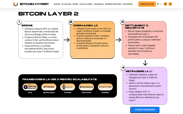 Ce face Bitcoin Hyper atât de interesant este că aduce rapiditate, costuri mici și funcționalități inteligente (smart contracts) într-un ecosistem cunoscut pentru stabilitate, dar mai lent. Practic, Bitcoin Hyper permite utilizatorilor să transfere Bitcoin aproape instantaneu, cu taxe minime, și să dezvolte aplicații complexe pe această rețea extinsă. O altă componentă esențială este puntea trustless care permite blocarea BTC pe lanțul principal și utilizarea acestora în Layer-2, fără intermediari.