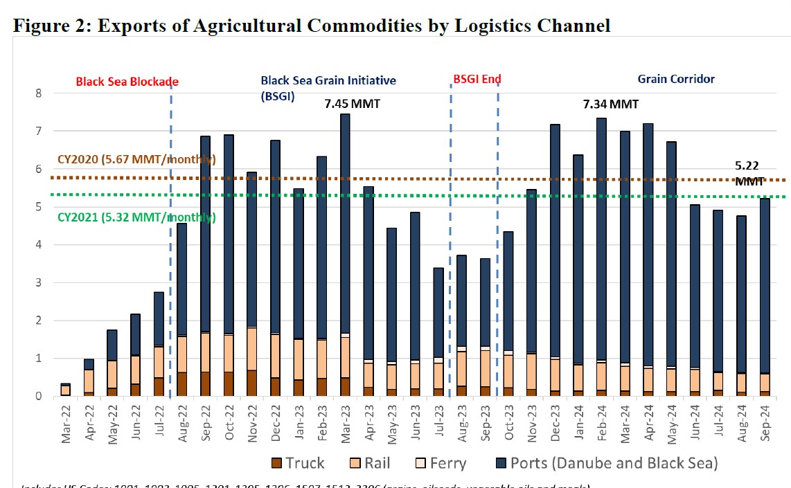 Acum, transporturile prin porturile de la Marea Neagră reprezintă cea mai rentabilă opțiune pentru Ucraina, în comparație cu transportul terestru (pe calea ferată și cu camionul). Odată cu repunerea în funcțiune a porturilor din regiunea Odesa, Ucraina și-a redus stocurile de cereale acumulate începând cu 2021/22, astfel că, pentru anul comercial 2024/2025, estimările indică existența unei cantități finale de 2,1 milioane de tone pe stoc, la fel ca în 2023/2024 când s-a raportat o scădere cu 82% față de 2022/23.