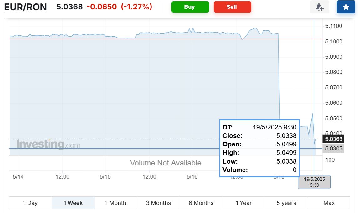 Euro a scăzut la 5,02 lei pe piaţa interbancară (ora 10.45 a.m.), după ce ieri, 18 mai 2025, ziua alegerilor prezidenţiale, moneda europeană a oscilat între 5,09 lei – 5,10 lei.