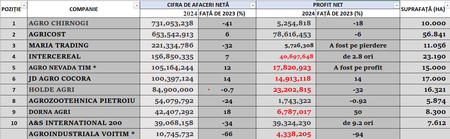 Astfel, dintre cele zece companii, prima după cifra de afaceri din 2024 este Agro Chirnogi, parte a grupului Maria controlat de mai mulți cetățeni libanezi din care face parte și Maria Trading, al treilea cel mai mare producător de cereale după cifra de afaceri.