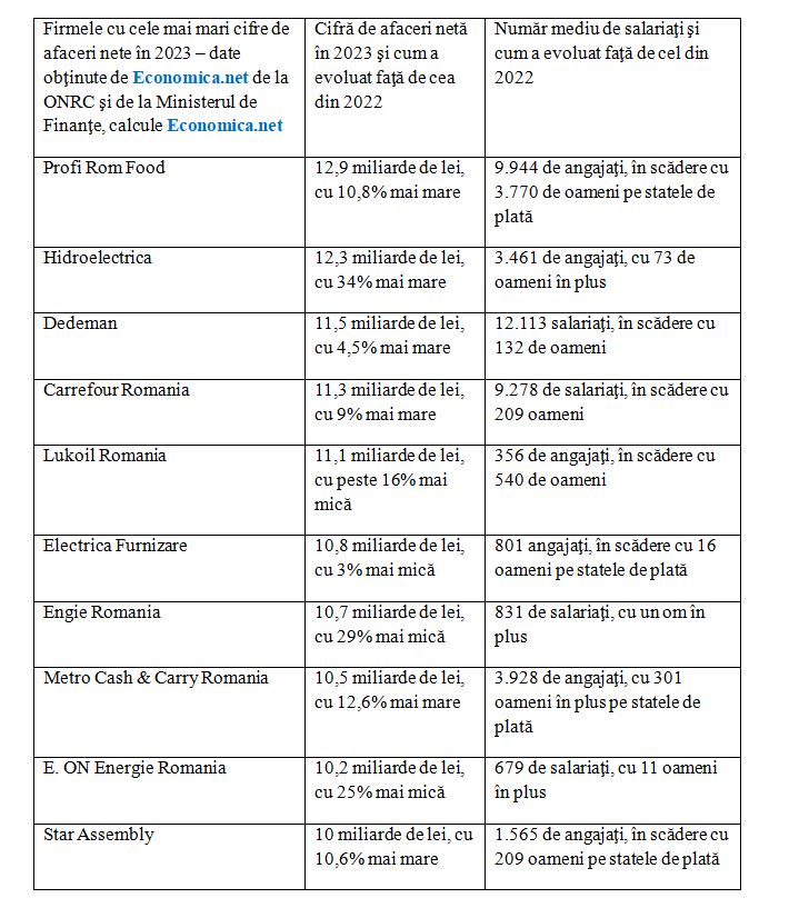 Afacerile nete realizate de Hidroelectrica, Metro Cash&Carry şi Star Assembly au depăşit pragul de 10 miliarde de lei în 2023.