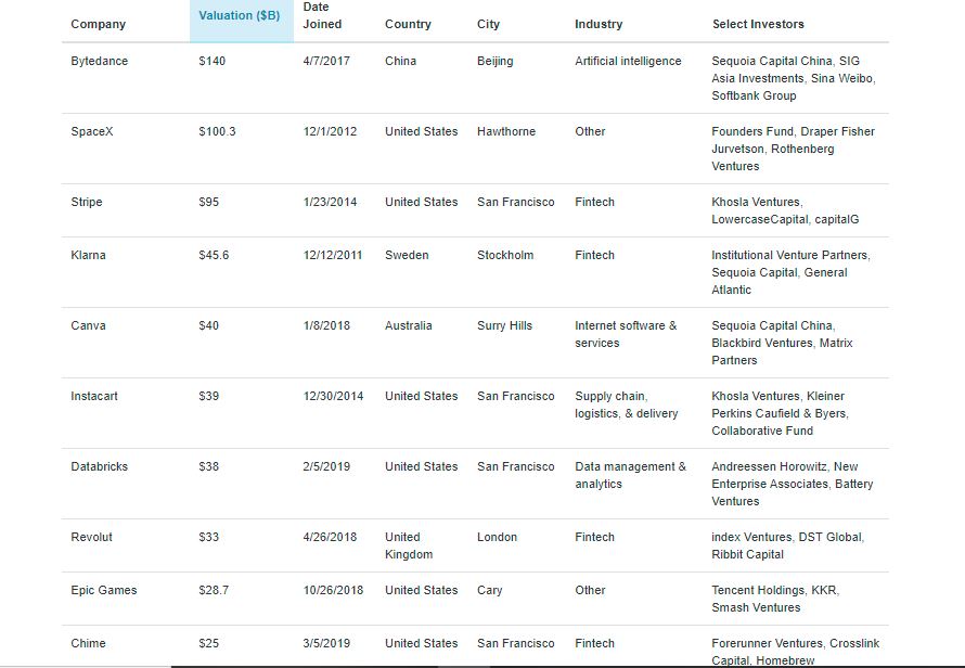 Multe dintre cele mai valoroase startup-uri sunt deja giganți în domeniile lor. De exemplu, compania chineză de social media Bytedance este dezvoltatorul din spatele platformei de rețele video Douyin și al versiunii sale internaționale, TikTok, și a acumulat o evaluare de 140 de miliarde de dolari, peste cea a companiei SpaceX deţinută de Elon Musk, evaluată în 2021 la 100 miliarde, după ce în vara anului trecut evaluarea se situa la „doar” 36 de miliarde de dolari.