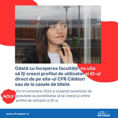 De la data de 01 decembrie 2024, facilitățile acordate studenților (inclusiv și celor din anul I) la călătoria cu trenul (bilete/abonamente lunare) se vor acorda numai în baza legitimației de student pentru reducere/gratuitate la transport vizată pentru anul universitar 2024-2025.