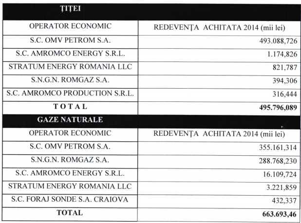 Situaţia redevenţelor din sectorul hidrocarburilor colectate în 2014, cu sumele şi firmele plătitoare.