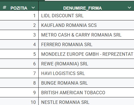 În locul Profi a intrat, pe poziția a opta, producătorul american de ulei Bunge, liderul pieței uleiurilor comestibile din România, care are în portofoliu branduri precum Unisol, Floriol și Unirea. Producătorul are două fabrici în România, în Lehliu-Gară și Buzău, unde produce biodiesel și ulei comestibil.