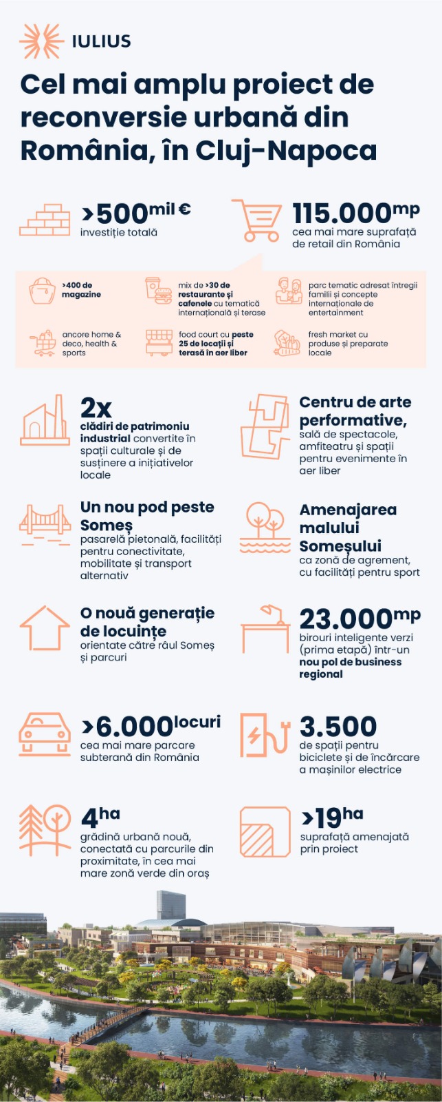 Ce propune IULIUS, concret, pe zona de retail în cel mai amplu proiect de regenerare urbană din țară? Cea mai mare suprafață de shopping și entertainment din țară, de 115.000 mp, care va fi ocupată de peste 400 de retaileri, branduri high end, premiere naționale și regionale, concepte de distracție pentru familii, zeci de restaurante cu tematică internațională și cafenele într-un singur loc, fresh market de susținere a antreprenorilor și producătorilor locali și mari retaileri cu specific home&deco, sport, health&beauty. La toate acestea se adaugă un centru de arte performative, o premieră la nivel de parteneriat între mediul de business și cel cultural, care va fi destinația pentru una dintre cele două clădiri de patrimoniu industrial pe care dezvoltatorul le va conserva și păstra în noul proiect. Alt element de unicitate este și o sală de spectacole, prima de acest tip integrată ca funcțiune a unei dezvoltări mixte din România. Practic, o destinație regională pentru petrecerea timpului liber, indoor și outdoor, pentru toate vârstele.