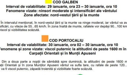 „Având în vedere faptul că pentru perioada 29 ianuarie – 30 ianuarie, au fost emise două coduri meteo, unul galben de ninsori moderate și intensificări ale vântului nord-vestul țării și la munte (în intervalul orar 23:00 – 10:00) și unul portocaliu ce intră în vigoare de mâine (în intervalul orar 02:00 – 10.00) de viscol puternic la altitudini de peste 1600 m în Carpații Orientali și în Munții Apuseni, facem apel la conducătorii auto să evite segmentele de drum afectate din aceste zone. Recomandăm conducătorilor auto să evite circulația în zonele afectate de coduri și precizăm că CNAIR împreună cu Poliția Rutieră pot lua decizia închiderii circulației pe anumite sectoare de drum dacă viața participanților la trafic este pusă în pericol”. se specifică într-un comunicat transmis către Economica.net.
