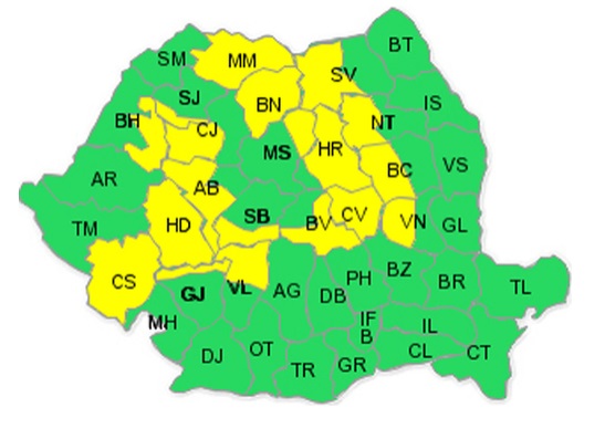 Avertizarea cod galben de ninsori şi viscol a fost emisă pentru judeţele: Suceava, Neamţ, Bacău, Vrancea, Maramureş, Bistriţa-Năsăud, Mureş, Harghita, Covasna, Braşov, Sibiu, Vâlcea, Gorj, Caraş-Severin, Hunedoara, Alba, Cluj, Bihor şi Sălaj.