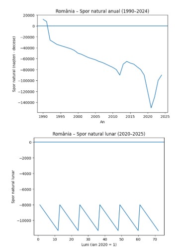 Ultimul an cu spor natural pozitiv (anual) a fost 1991. Din 1992, România a înregistrat, în fiecare an, doar valori negative. În perioada 2020-2025 a fost înregistrat un declin accelerat, fără excepţii lunare, conform datelor sintetizate de ECONOMICA.NET.