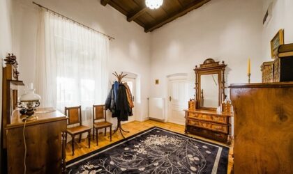 Cerdacul este generos, fiind elementul ornamental care domină intrarea. Atmosfera sfârşitului de secol XIX este păstrată prin mobilierul masiv.