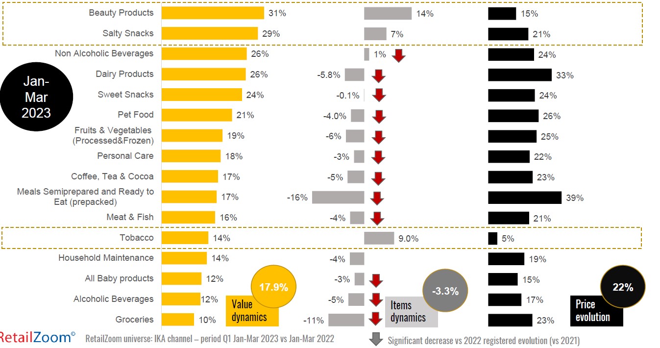 Totodată, vânzările promoționale și-au reluat puterea de influență, înregistrând pentru prima data în ultimii 6 ani o creștere valorica de 37% în T1 2023 față de T1 2022. S-a ajuns ca acestea să aibă o contribuție de 22% din totalul vânzărilor valorice vs 20.4% în 2022).