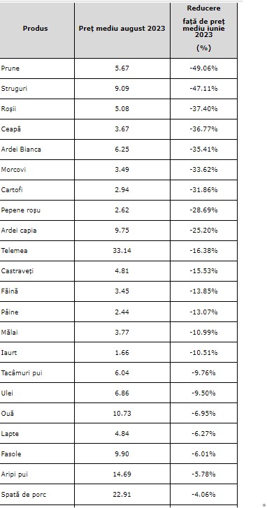 Cele mai mari reduceri s-au înregistrat la fructe și legume: prețul mediu al prunelor a scăzut cu 49%, cel al strugurilor, cu 47%, în timp ce roșiile, ceapa, ardeii galbeni, morcovii și cartofii s-au ieftinit cu 31% până la 37%, în august 2023 față de iunie 2023.