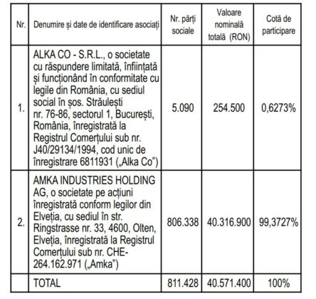 Înainte de fuziune, capitalul social al firmei Alka Co e de 7.955.600 de lei, subscris și integral vărsat, împărțit în 79.556 de părţi sociale cu valoare nominală de 100 lei. Alka Co e deţinută de Amka Industries Holding AG din Elveţia, conform proiectului de fuziune consultat de Economica.net.
