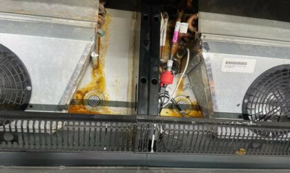 prezența, în vitrinele de patiserie și panificație sau în cele de cofetărie, a unor tăvi din inox cu strat gros de arsură, grăsimi cu particule de praf, rugină, lichid acumulat în exces cauzat de uncționarea precară a agregatelor și resturi alimentare;