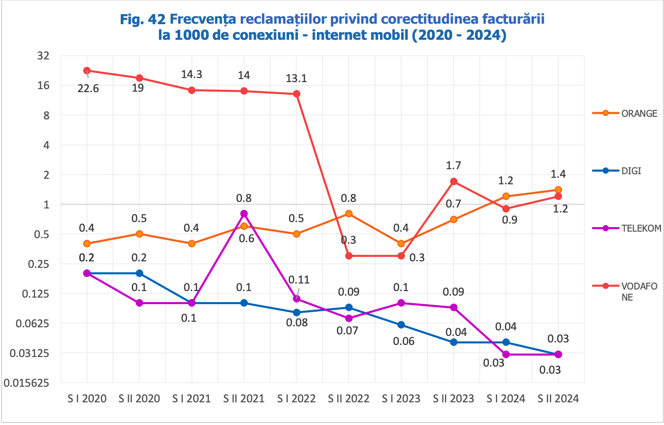 Pe termen mediu, în ultimii 5 ani, datele arată, în general, o tendință de creștere a numărului de reclamații privind corectitudinea facturării pentru Orange (de la 0,4 la 1,4) și de scădere pentru Digi (de la 0,2 la 0,03) și Vodafone (de la 22,6 la 1,2). Pentru cel de-al patrulea furnizor mobil, respectiv Telekom, tendința este de scădere până la sfârșitul anului 2022, urmată de creșteri și scăderi succesive, până la finalul lui 2024 (0,03).