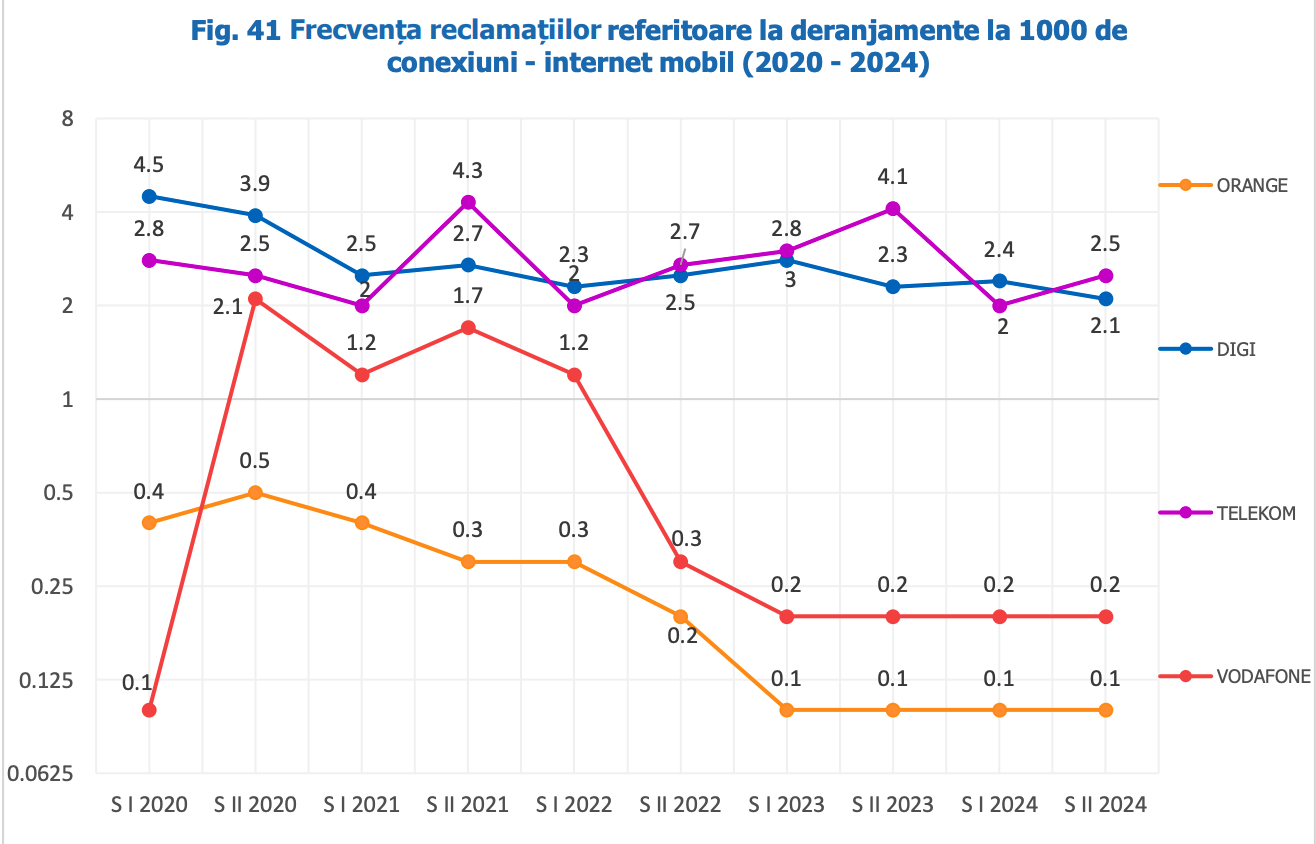 La internetul mobil, în general, numărul reclamațiilor la 1.000 de conexiuni active este mult mai mic decât în cazul internetului fix. Numărul reclamațiilor înregistrate în 2024 la 1.000 de conexiuni active se încadrează în intervalul 2,2 – 4,1. Digi, Telekom și, în special, Vodafone, au reușit să reducă semnificativ numărul de reclamații la 1000 de conexiuni între sfârșitul anului 2020 și sfârșitul anului 2024. Pe de altă parte, Orange a înregistrat o ușoară creștere a frecvenței reclamațiilor în aceeași perioadă de la 2,6 (semestrul doi 2020) la 4.1 (semestrul doi 2024). Digi a coborât de la 4,5 la 2,2, Telekom a avut o ușoară scădere de la 2,9 la 2,6, iar Vodafone a înregistrat o scădere spectaculoasă a frecvenței reclamațiilor, de la 24.1 la doar 2,6.
