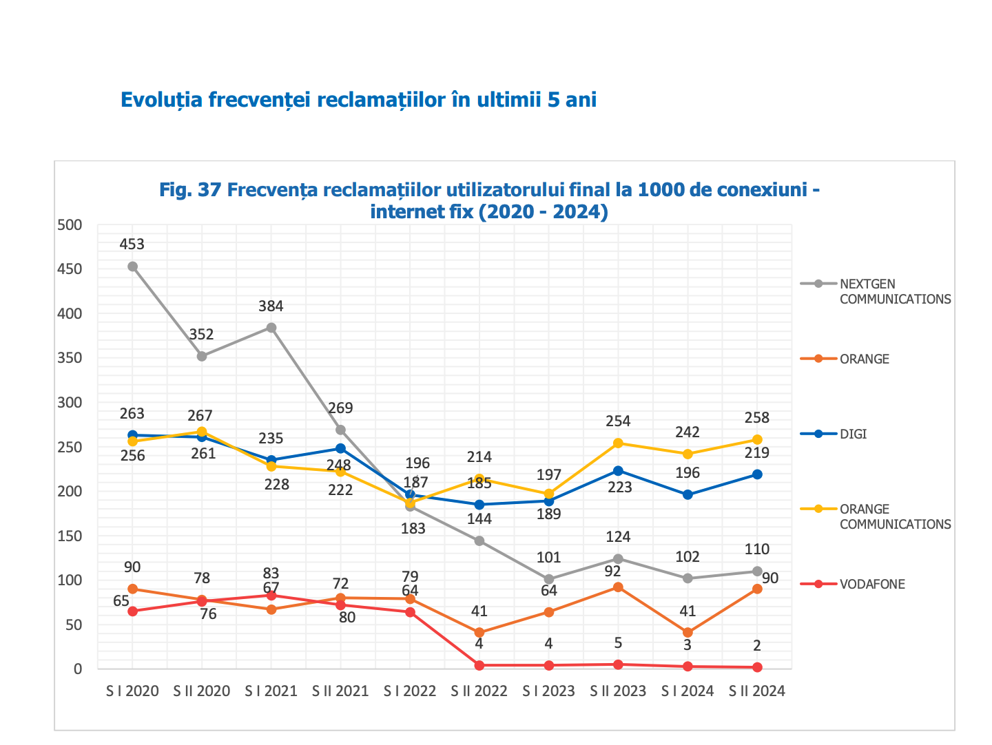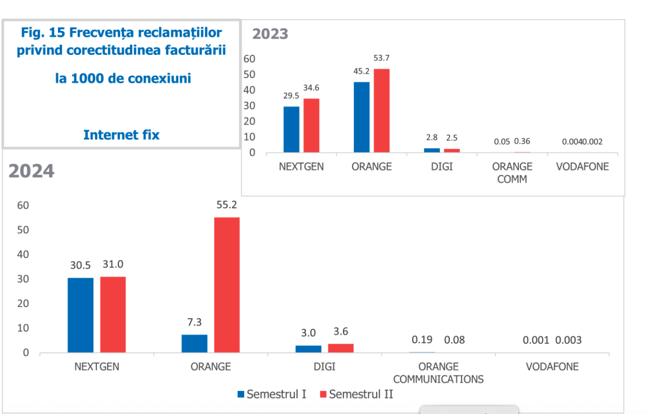 În contrast, Vodafone a înregistrat o scădere dramatică a frecvenței reclamațiilor, de la 76 la doar 2 la 1.000 de conexiuni, iar Digi a înregistrat fluctuații în ultimii cinci ani, dar a încheiat perioada cu o scădere ușoară a reclamațiilor, de la 261 la 219 la 1.000 de conexiuni.