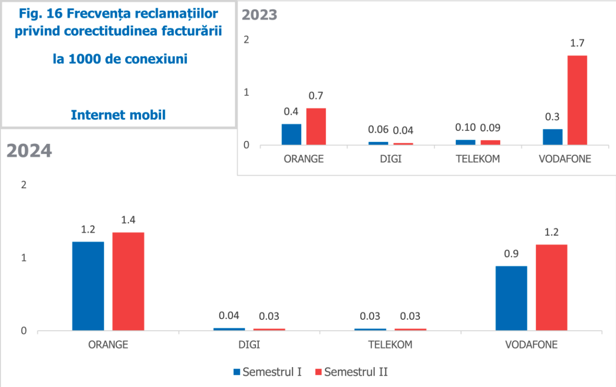 La internetul mobil, furnizorii au raportat, în general, valori foarte mici (mai mici decât 2). Vodafone a înregistrat o creștere pe primul semestru și o scădere pe al doilea semestru, iar Orange a înregistrat creșteri ale acestui parametru pe ambele semestre ale lui 2024, în comparație cu valorile semestriale înregistrate anul precedent. Pentru acești 2 furnizori numărul de reclamații privind corectitudinea facturării a crescut de la primul la al doilea semestru al anului 2024.