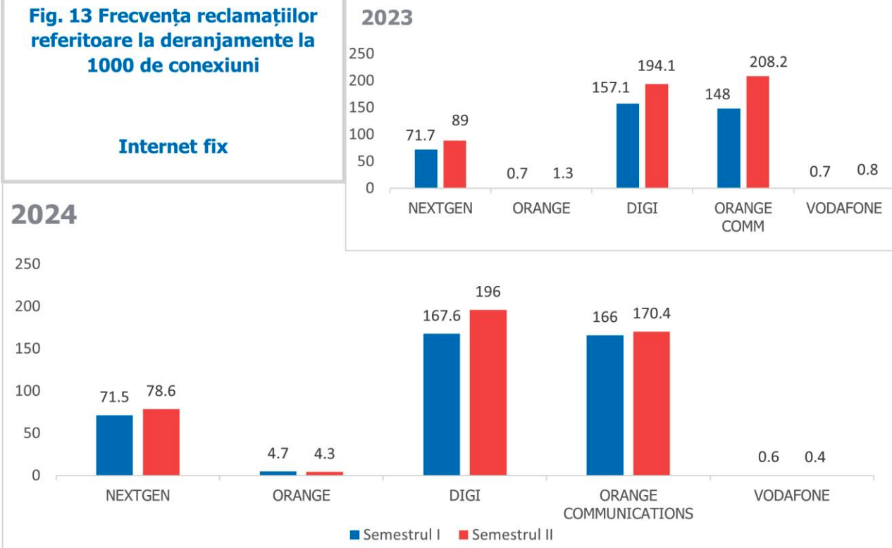 În schimb, tot pentru același parametru, Orange Communications a înregistrat o creștere la nivelul celui de-al doilea semestru, de la 1.8 la 4.1 ore. Referitor la valorile duratei în care se încadrează 80% din cel mai rapid remediate deranjamente, Nextgen a înregistrat o creștere la nivelul primului semestru (de la 3.1 la 4.3 ore), iar Orange a înregistrat scăderi ale valorilor acestui parametru, față de anul precedent la nivelul ambelor semestre. De asemenea, pentru Digi valoarea acestui parametru a scăzut pentru al doilea semestru, de la 2.6 la 1.8 ore, comparativ cu cea consemnată în anul precedent.