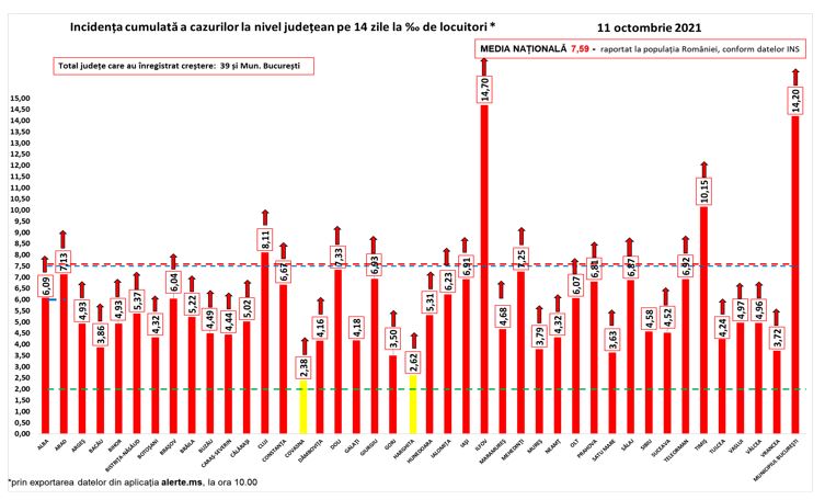 Media naţională a ratei de infectare este de 7,59 la mia de locuitori.