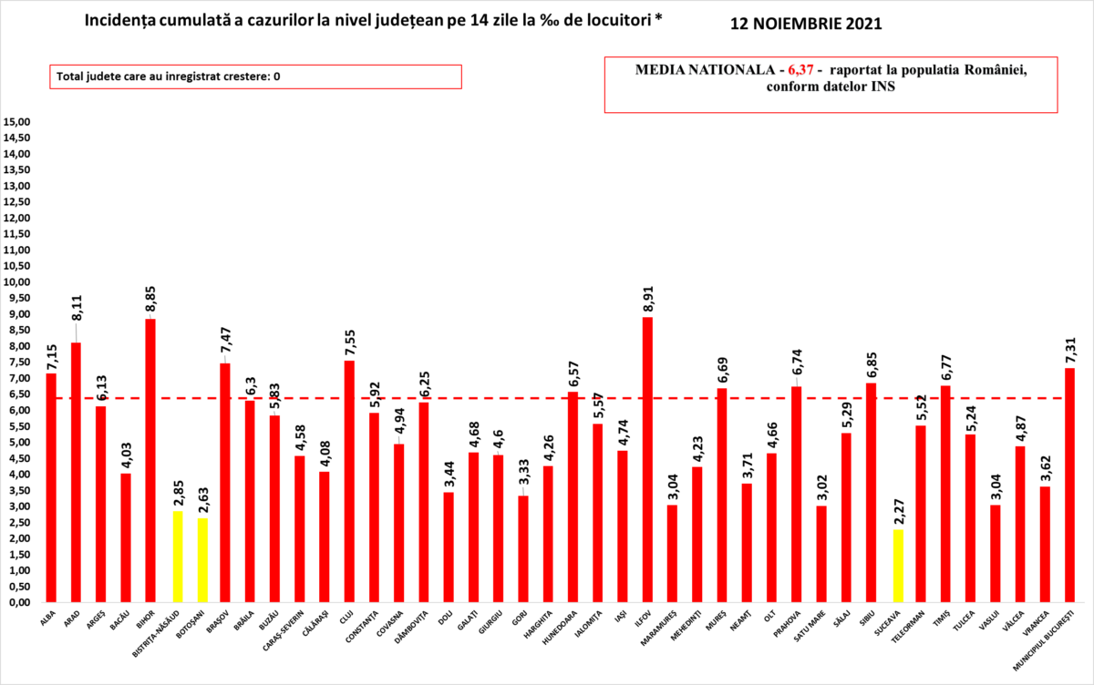 Media naţională a ratei de infectare este de 6,37 la mia de locuitori.