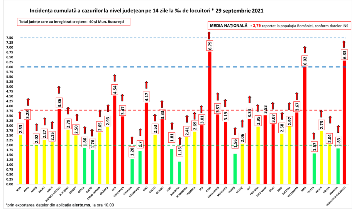 Media naţională a ratei de infectare este de 3,79 la mia de locuitori.