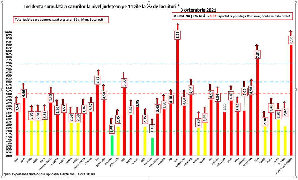Media naţională a ratei de infectare este de 5,07 la mia de locuitori.