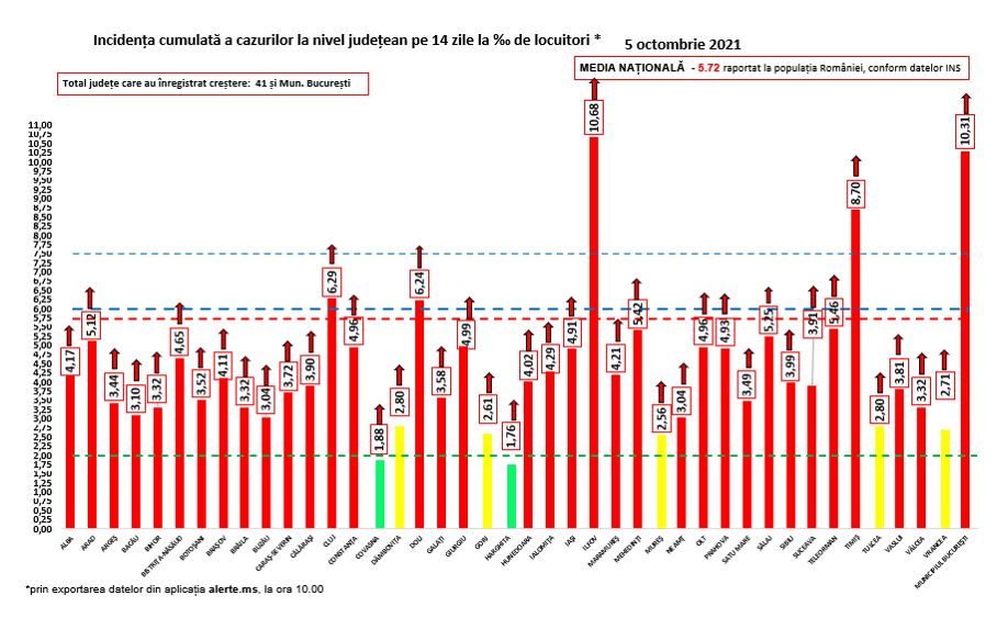 Media naţională a ratei de infectare este de 5,72 la mia de locuitori.