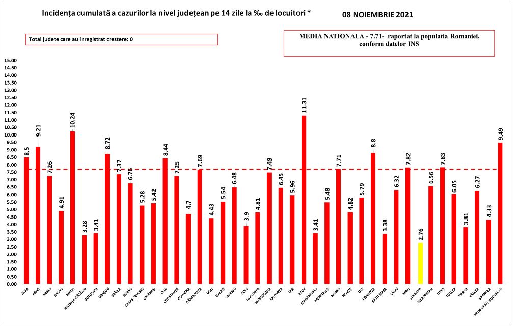 În intervalul 07.11.2021 (10:00) – 08.11.2021 (10:00) au fost raportate de către INSP 241 de decese (109 bărbați și 132 femei), din care 1 anterior intervalului de referință, ale unor pacienți infectați cu noul coronavirus, internați în spitalele din Alba, Arad, Argeș, Bacău, Bihor, Bistrița-Năsăud, Brăila, Brașov, Buzău, Călărași, Caraș-Severin, Cluj, Constanța, Covasna, Dâmbovița, Dolj, Giurgiu, Gorj, Harghita, Ilfov, Maramureș, Mehedinți, Neamț, Olt, Prahova, Sălaj, Satu Mare, Sibiu, Suceava, Timiș, Vaslui și Municipiul București.