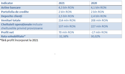 Venitul total al băncii pentru anul 2021 a fost 214 milioane de lei, înregistrând o ușoară creștere de 2,8% față de aceeași perioadă a anului 2020. Pe de altă parte, cheltuielile operaționale au scăzut cu 39,6%, ajungând la 137 de milioane de lei la finalul anului 2021.
